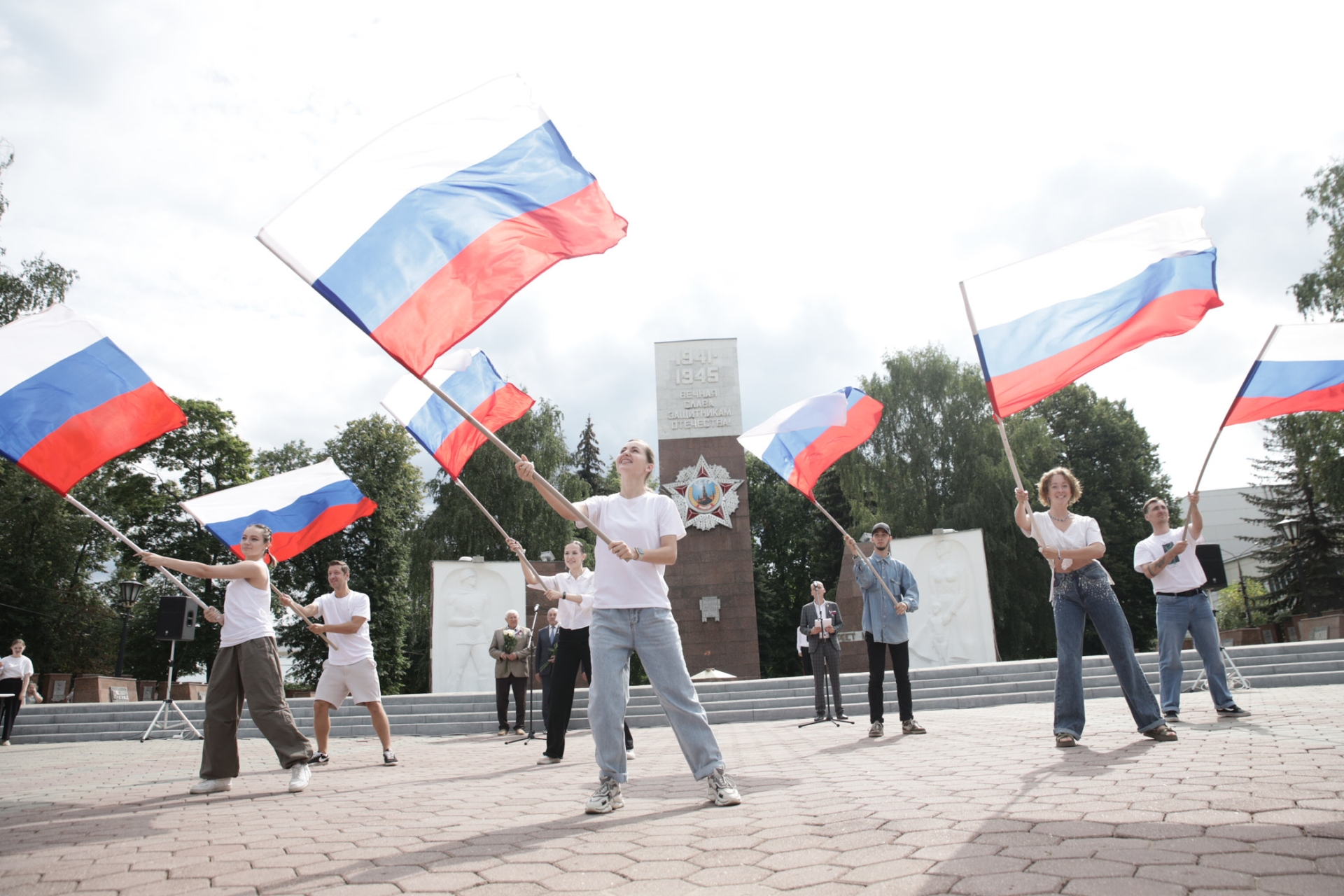 Солист ансамбля «Серебряные крылья» Дмитрий Погора исполнил песню «Россия». Завершился праздник флешмобом с развивающимися флагами. После него к Вечному огню возложили цветы.