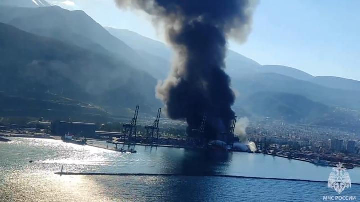 МЧС России показало кары тушения турецкого порта Искандерун, снятые с борта российского самолета Бе-200.