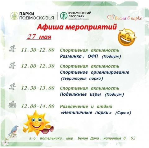 Представляем Вам афишу активностей и мероприятий в Кузьминском лесопарке на предстоящие выходные 27 и 28 мая!