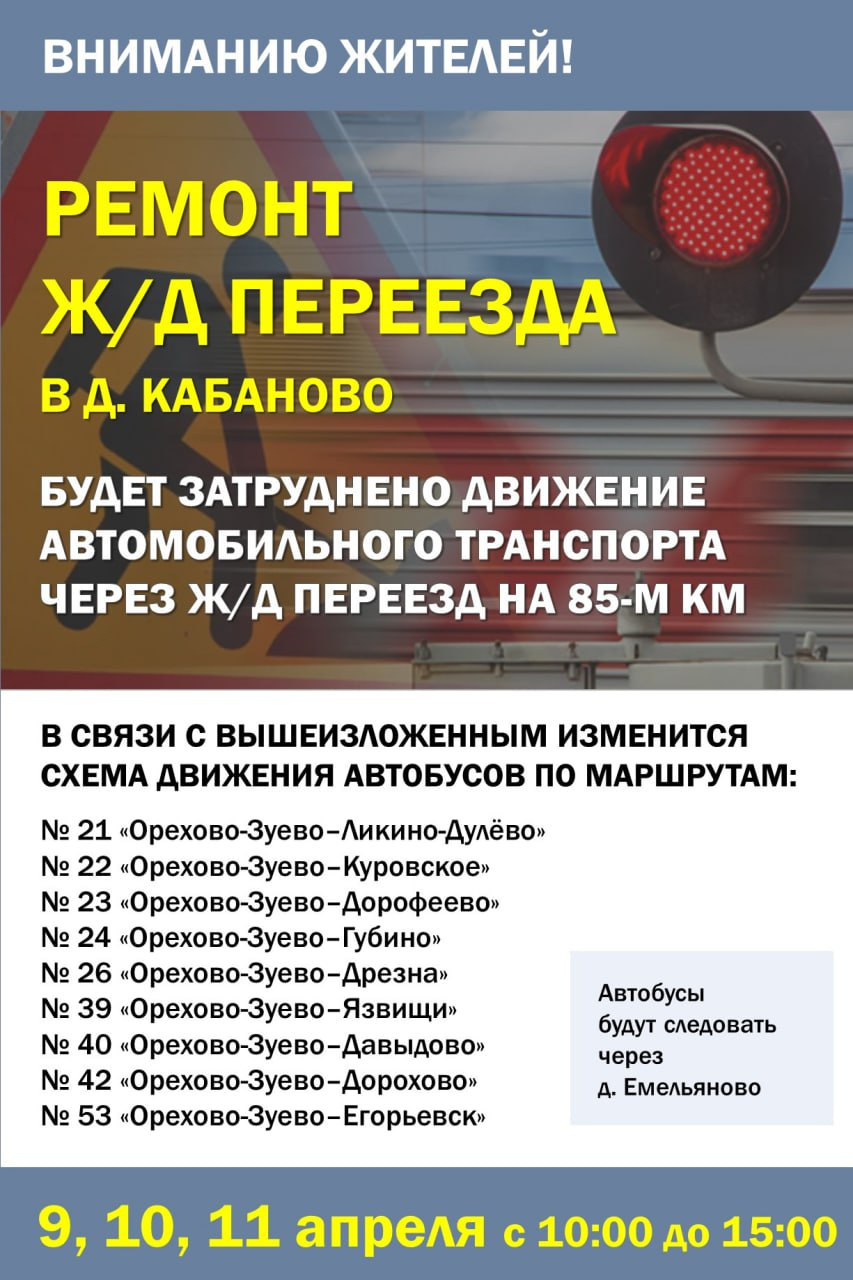 Во вторник, среду и четверг с 10 часов утра до 3 часов дня будет затруднено движение автотранспорта через железнодорожный переезд, который расположен на пересечении 85-го км станции Орехово-Зуево и деревни Кабаново на А-108 МБК.