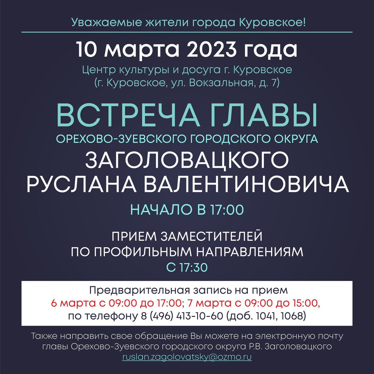10 марта в 17.00 состоится встреча главы Орехово-Зуевского округа Р.В. Заголовацкого с жителями города Куровское.