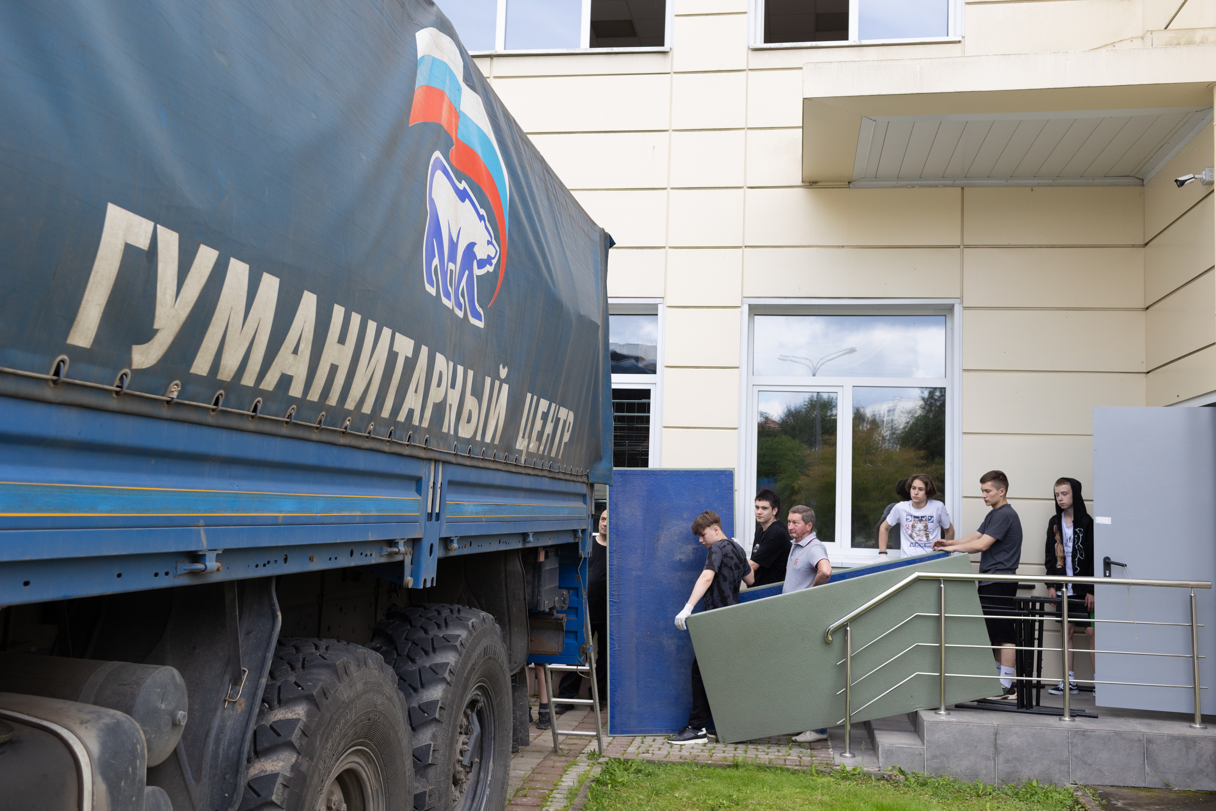Огромный КАМАЗ с надписью «Гуманитарный центр» на борту припаркован к зданию школы. Погрузкой занимаются волонтёры-старшеклассники. Они переносят в кузов машины разобранные парты, спортивный инвентарь и другие вещи, нужные для учёбы. Этот груз очень ждут в школе №7 города Ясиноватая Донецкой Народной Республики.