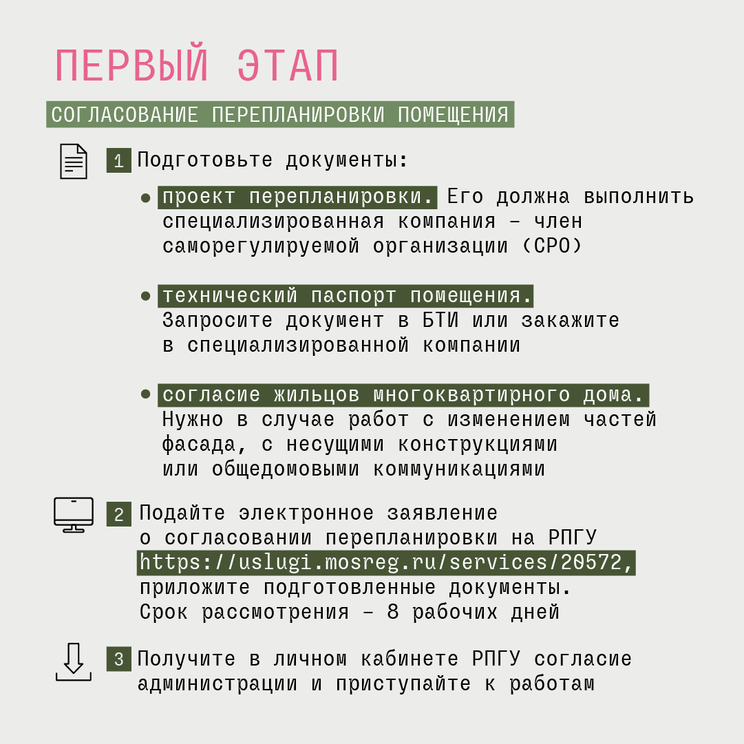 После подготовки комплекта документов подайте электронное заявление о согласовании перепланировки на РПГУ https://uslugi.mosreg.ru/services/20572