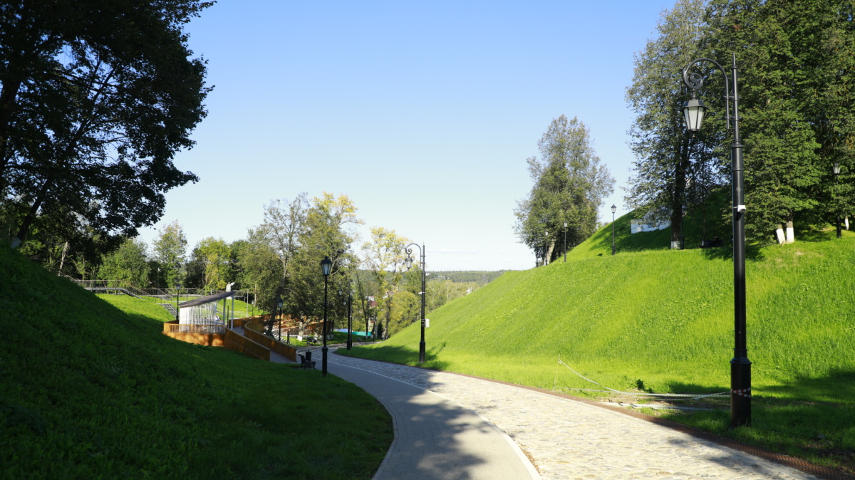В ходе работ этого года территорию у Городища расчистили от сухих деревьев, провели дополнительное озеленение. Склон, на котором стоит местный кремль, укрепили. Проложили новые пешеходные дорожки, установили перголу, оборудовали смотровую площадку и места для отдыха. Разместили на территории новые скамейки и урны, провели освещение и установили камеры видеонаблюдения.