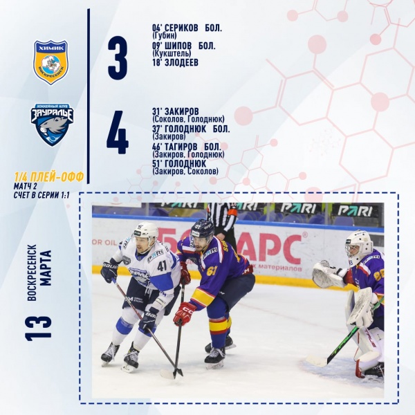 Второй период жёлто-синие начали словно по инерции, вот только «Зауралье» мириться с «баранкой» в графе заброшенные шайбы не торопилось, а потому к исходу второго периода на табло уже были стимулирующие гостей цифры – 2:3. Свою голевую жажду «бобры» сполна утолили в 3 периоде, когда на 46-й минуте в большинстве счёт сравняли (не обошлось без досадного рикошета), а вскоре забросили ещё раз – 4:3. Перевернуть игру жёлто-синим теперь уже не удалось, пусть и получили «химики» на финише основного времени два большинства, пусть и штурмовали ворота «Зауралья» вшестером. Серия переезжает в Курган при равном счёте – 1:1.