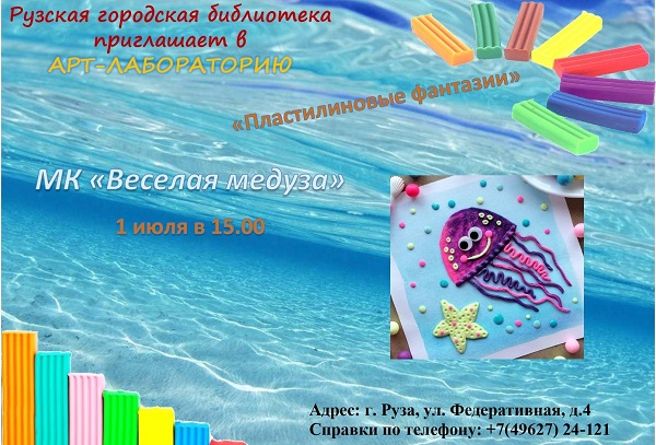 Сотрудники Рузской городской библиотеки приглашают в арт-лабораторию «Пластилиновые фантазии» на мастер-класс «Веселая медуза», который состоится 1 июля в 15 часов.