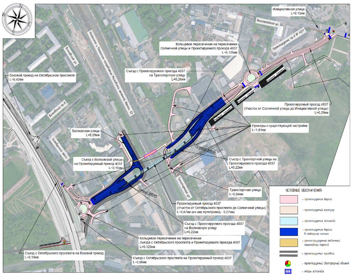 «Дорога пройдет по Проектируемому проезду № 4037 и соединит улицу Инициативную с Октябрьским проспектом. В месте примыкания к Октябрьскому проспекту будет построена одноуровневая кольцевая развязка, а также предусмотрены два съезда с улицы Транспортная и два съезда с Волковской улицы. Помимо этого, планируется реконструкция существующего тоннеля под пешеходный переход», — рассказал Иван Игнатов.