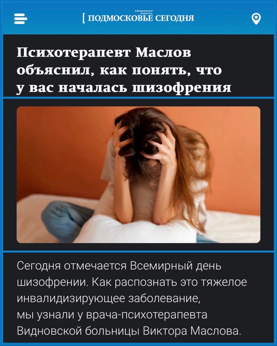 Поскольку сегодня отмечается Всемирный день шизофрении, журналисты одного из ведущих региональных новостных агентств попросили эксперта прокомментировать эту тему. При этом mosregtoday.ru уже давно оценило высокий профессионализм и компетентность наших медиков, поэтому авторитетным спикером вновь стал представитель коллектива нашей больницы - врач-психотерапевт Видновской РКБ Виктор Маслов.
