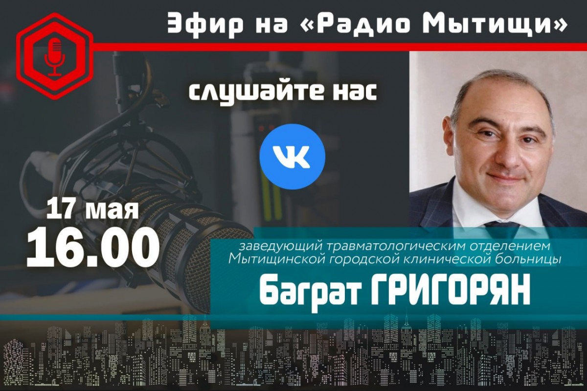 Сегодня, 17 мая, в 16 часов заведующий травматологическим отделением МГКБ, кандидат медицинских наук Баграт Степанович Григорян станет гостем прямого эфира «Радио Мытищи». Смотрите и слушайте программу «Врача вызывали?» в социальной сети «ВКонтакте!». Прямой эфир: https://vk.com/radiomytyshy