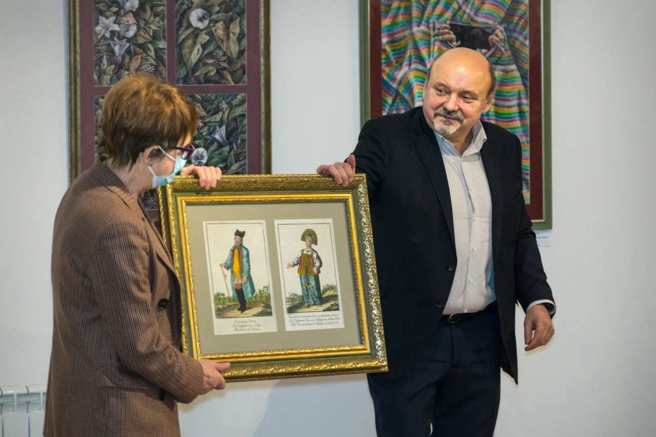 Делегация троицких художников, глава города Владимир Дудочкин и сотрудники администрации нашего города подготовили подарок музею от Троицка: картины Юрия Пекуровского, на которых изображены калужские купец и купчиха, а также вид старинного губернского города.