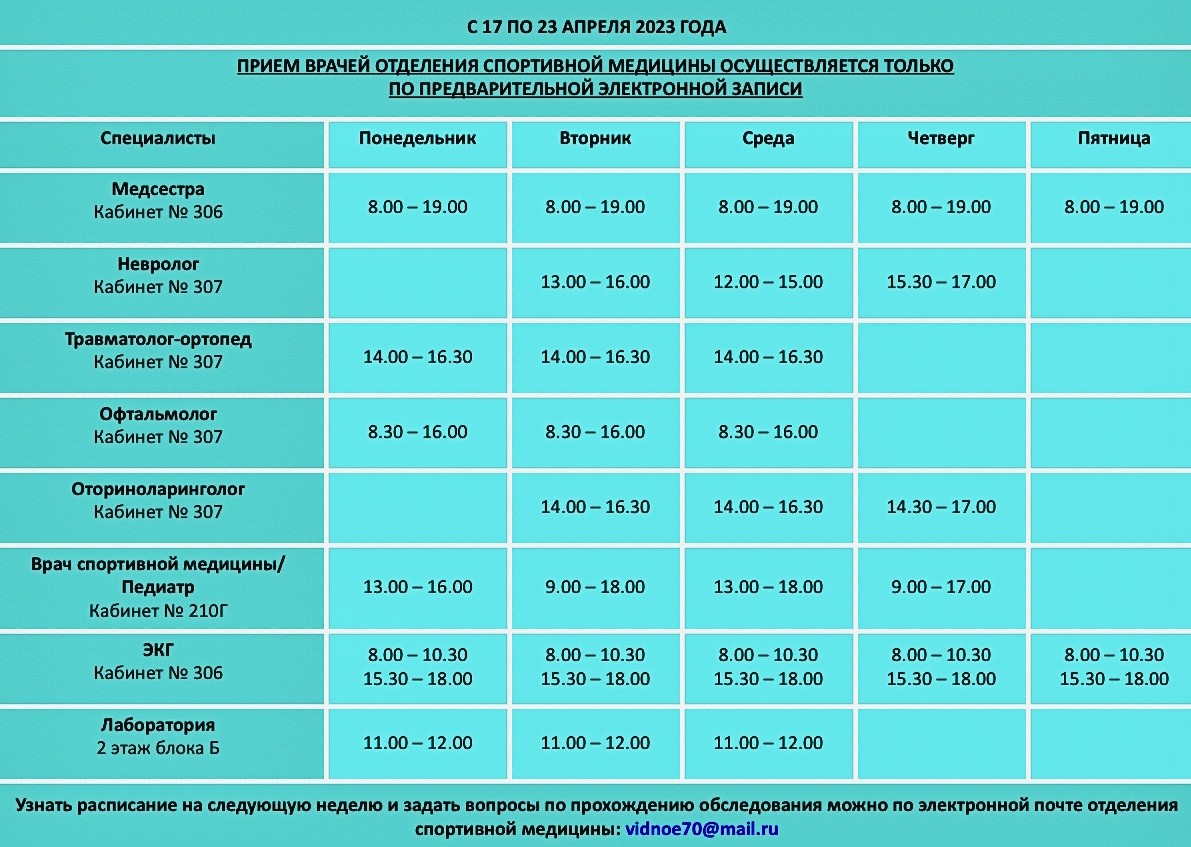 Отделение спортивной медицины Видновской РКБ продолжает свою работу. Сегодня мы публикуем график работы отделения на следующую неделю и уточняем порядок записи на прием к врачам и порядок обследований.
